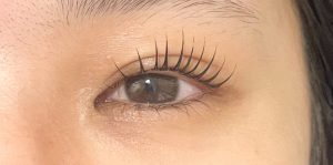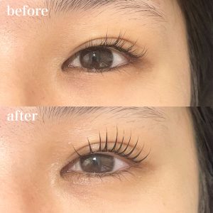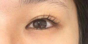 元々まつ毛が下がっていて瞼が被っている部分もあるため、瞼に当たらないように根元に奥行きをつけ、中間から毛先にかけてはストレートにまっすぐ上げる