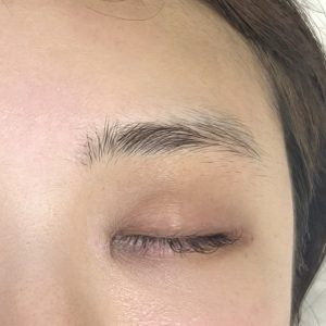 眉元の形は自眉の毛流れと長さを平行デザインで活かしつつ眉上と眉下のラインを整え、元々の眉頭の癖が左右差をだしてしまうので、癖が表に出ないよう間引きでぼかしながら全体を均一に揃えました。