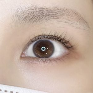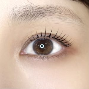瞼が引き上がるような生え際のリフトアップ効果もだしつつ、強くばっちりした印象よりは、柔らかくカールを斜め上向きに向かってあげていく事で、ぱっちりとしたお目元に柔らかさを映すデザインがお客様のイメージと合うため、ご提案致しました。